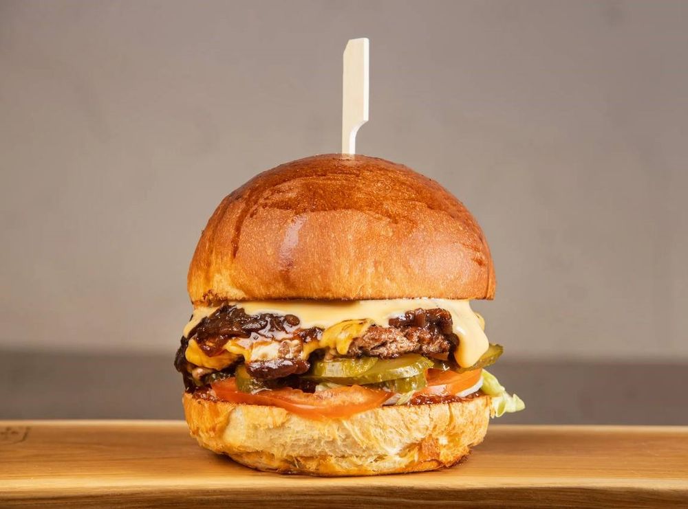 фирменная булочка, котлета из 100% говядины, свежий салат, карамелизированный лук, томат, огурец маринованный, сыр чеддер, соус пряная глазурь, соус сырный