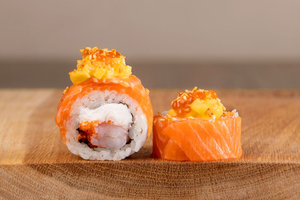 рис, нори, лосось, креветка, сливочный сыр, икра тобико, манго, икра лосося