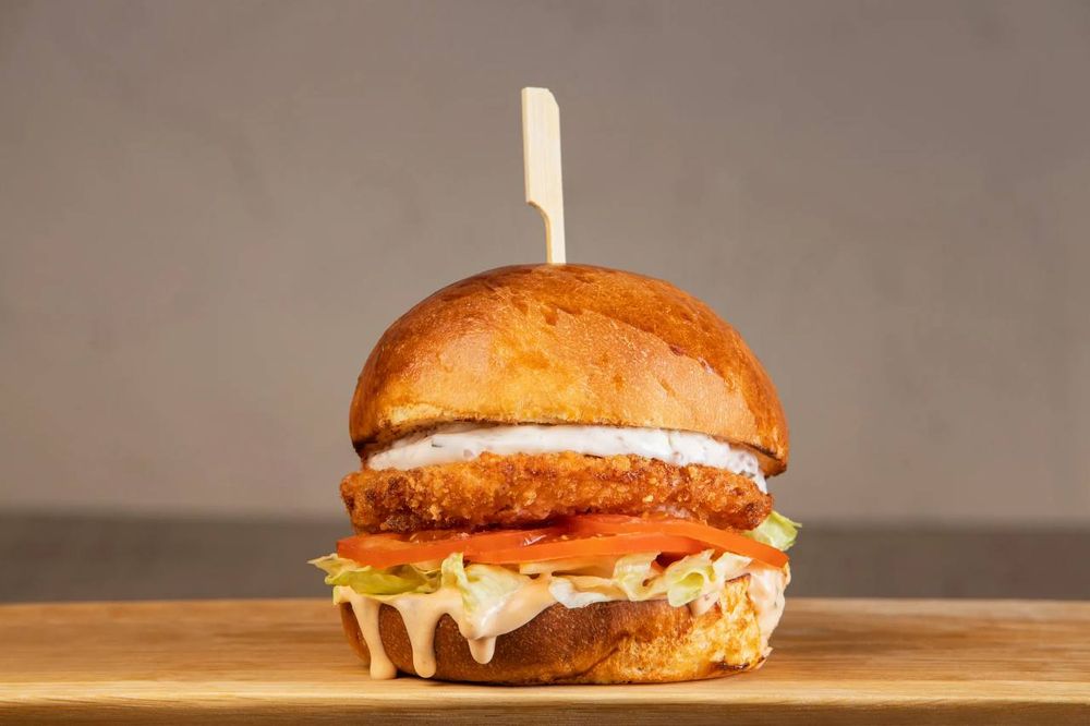 фирменная булочка, котлета из креветки и лосося, свежий салат, томат, соус тартар, соус чили-кокос