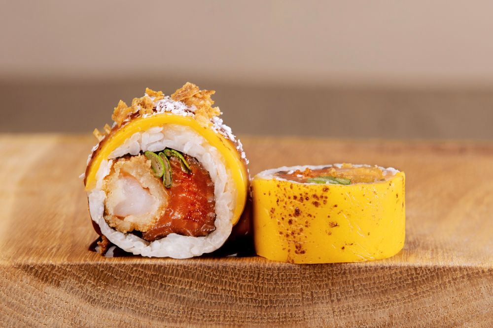 Ролл с лососем, креветкой и манго