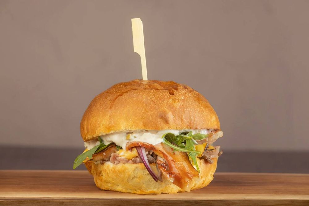 фирменная булочка, ростбиф, маринованный лук, сыр чеддер, бекон, руккола, соус пастрами